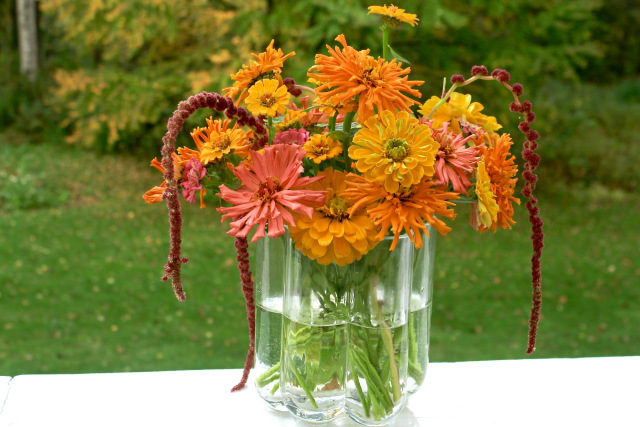 Frost has finished my annuals and the perennials are slowly following, as Nature pushes them into dormancy. Here I share the last arrangements I made before their demise. I put all the mixed zinnias (Z. elegans) into one vase with a few Love-lies-bleeding (Amaranthus caudatus), which never became full size before the deer came for a visit. 😦