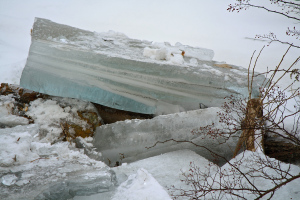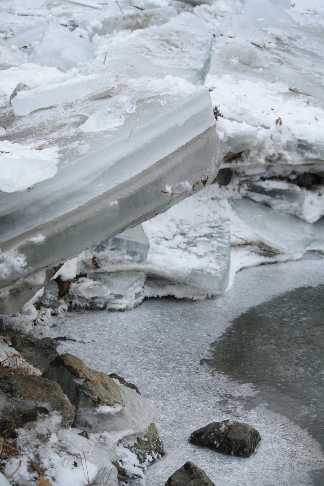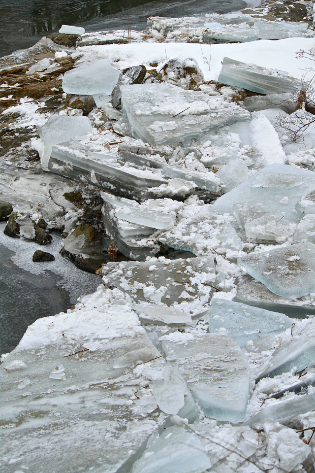 Last Sunday’s rain storm raised the water level on the river by about six feet, breaking up the frozen ice into large chunks that were four to twelve inches thick. Flowing downstream in the flood, some of these icebergs stuck in an eddy in the bend of the river below the bluff and were left in stacks up to five feet deep when the water receded.