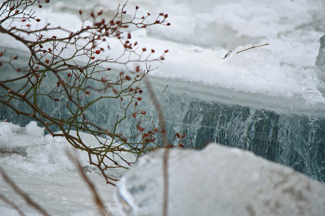 Each floe had a varied grain depending on how cold it was when each layer froze and how clear or turbulent was the water at that time. Some were the loveliest aquamarine color, while others were crystal clear, solid snow-white, in-between opaque or muddy brown.
