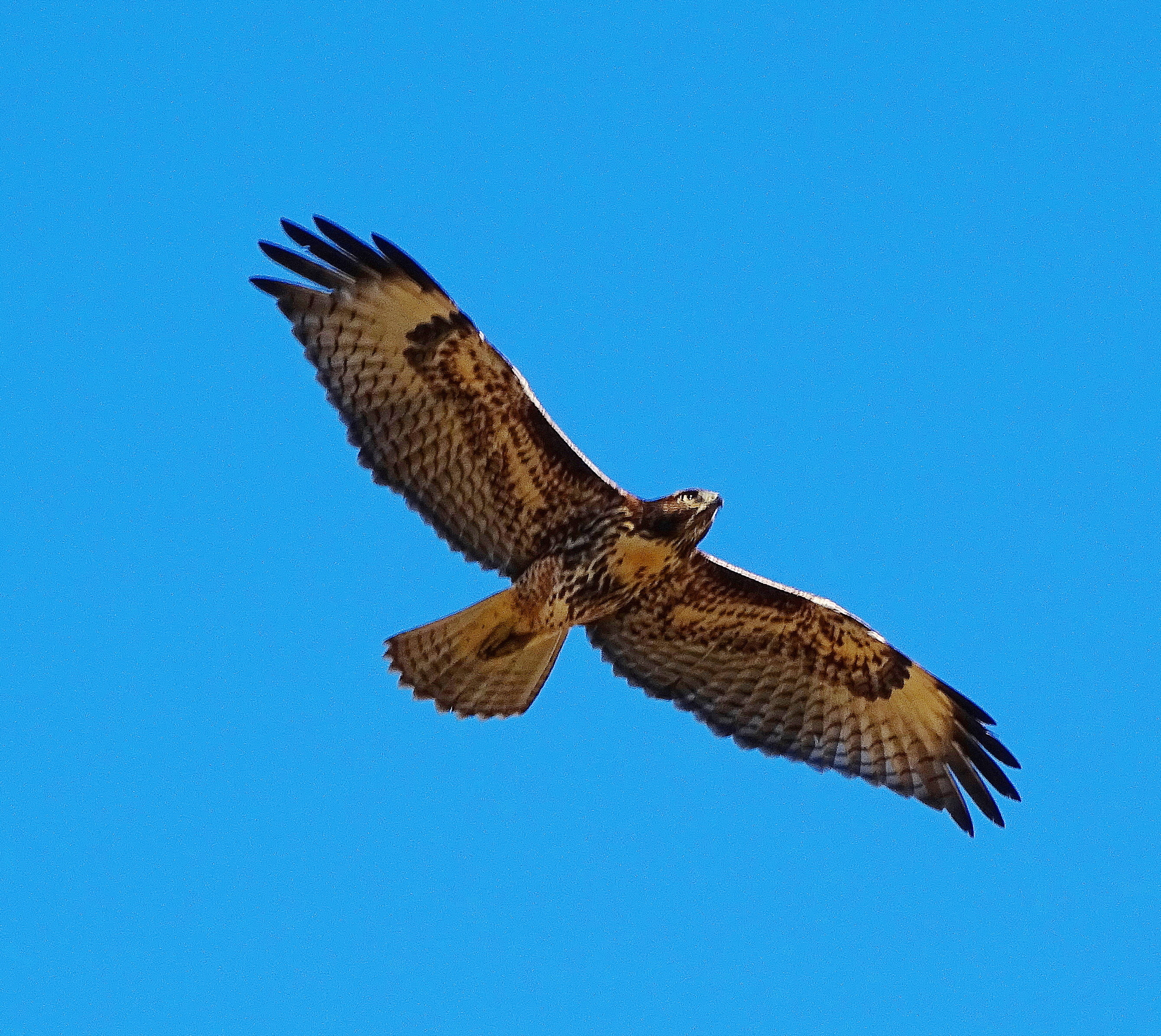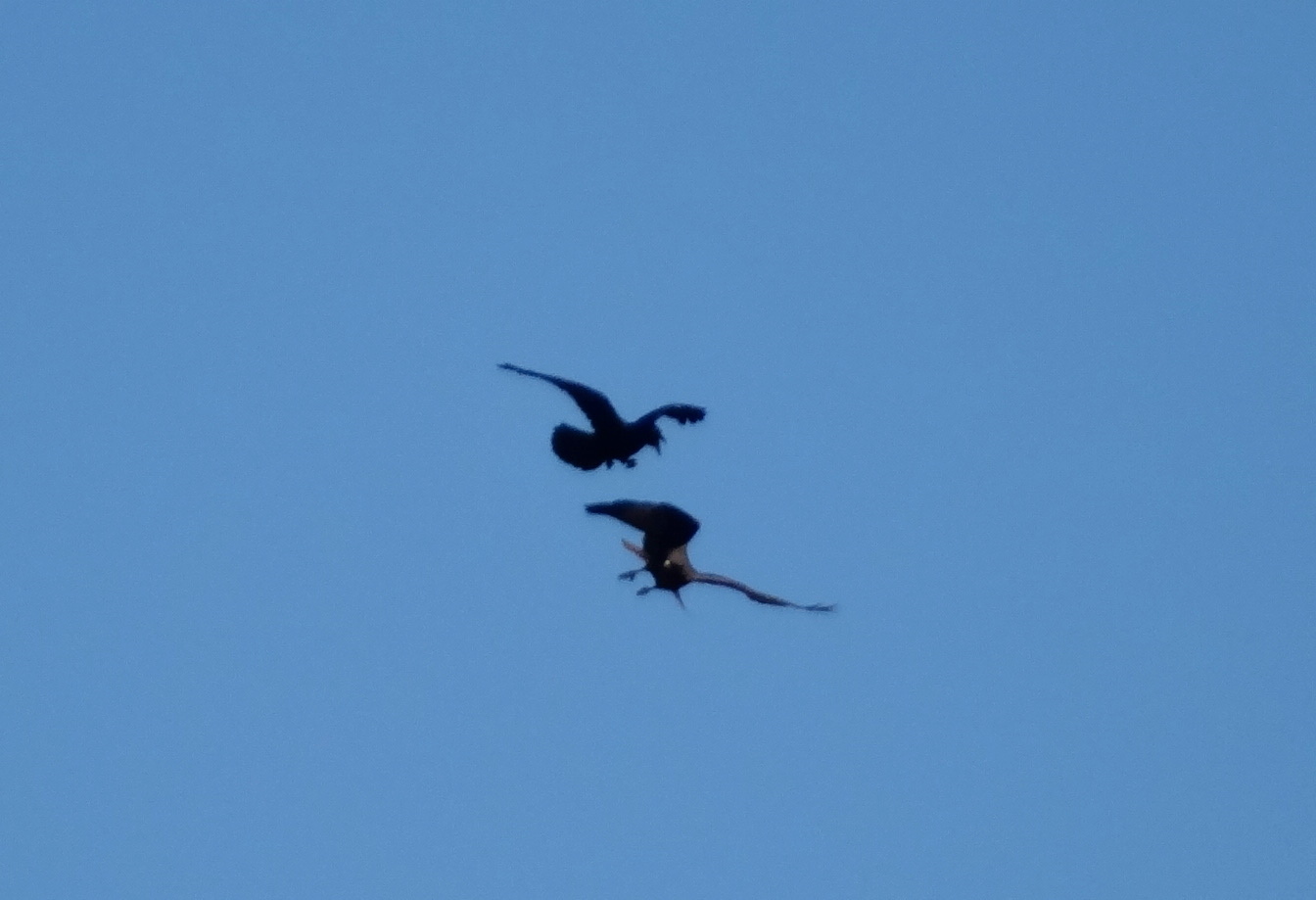 Here is an actual attack shot into the sun so it’s not a good photo, but you can see the hawk reeling from the raven’s slam and you can see the raven screaming!