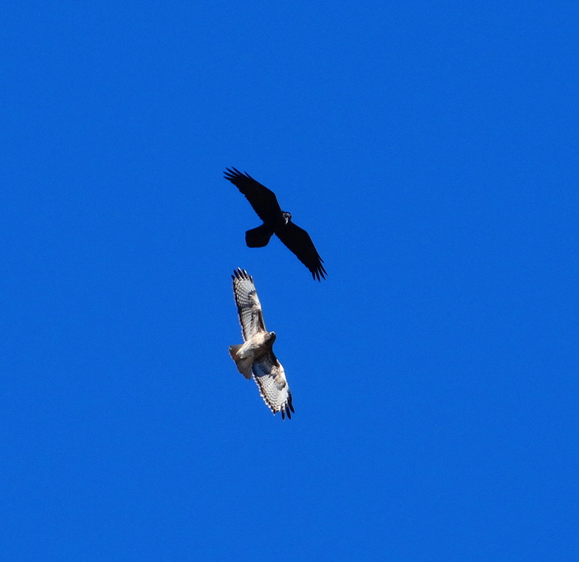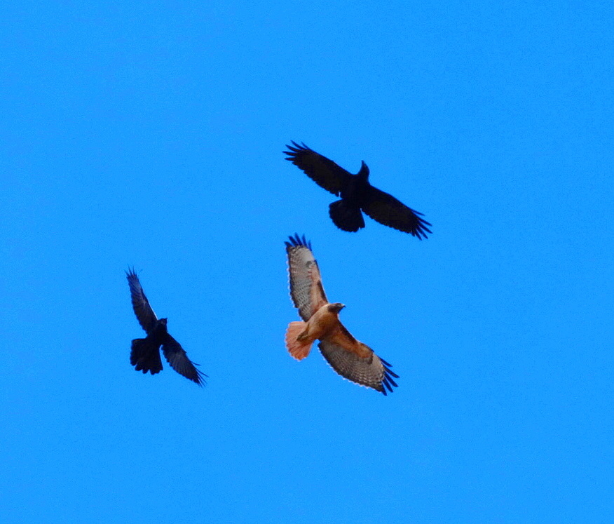 They fight continuously. The hawks hold their own for the most part, despite the disparity in numbers. I wonder how they get time to hunt though, since so much of their time is spent fending off attacks from the ravens.