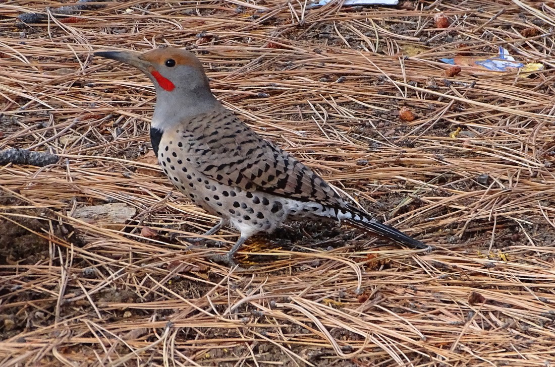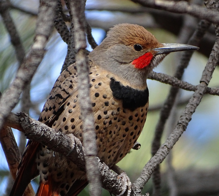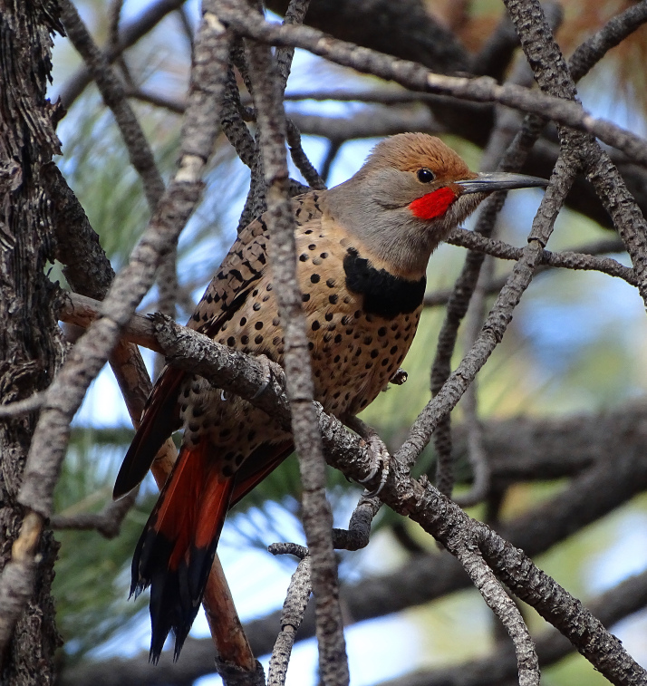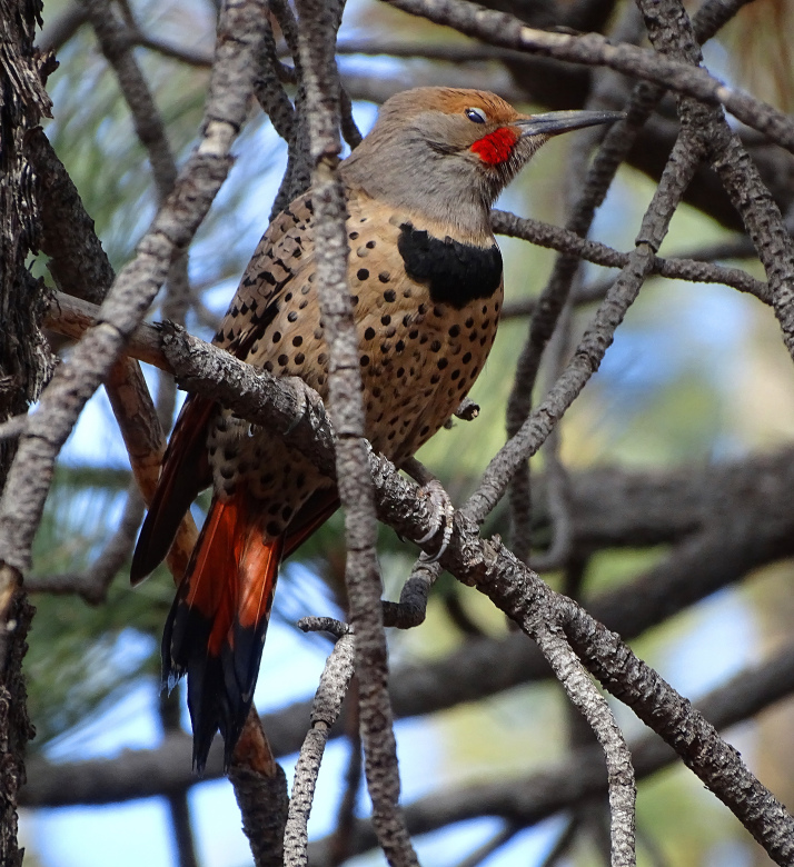 In the western US, Flickers have red cheeks and tail feathers, but in the east they have yellow accents.