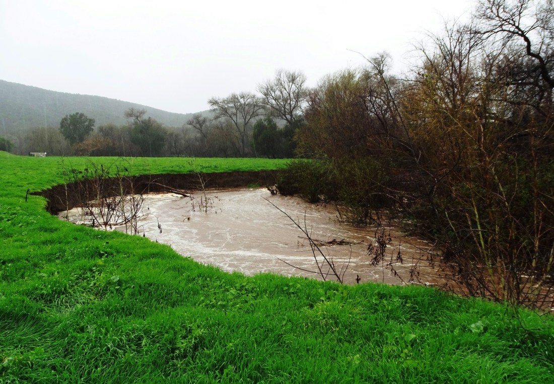 Here is the lower pasture being chewed up by the little creek which turned into a rapid-filled, raging river. The pasture gate is the white structure in the back left of the photo. It partially collapsed in the onslaught.
