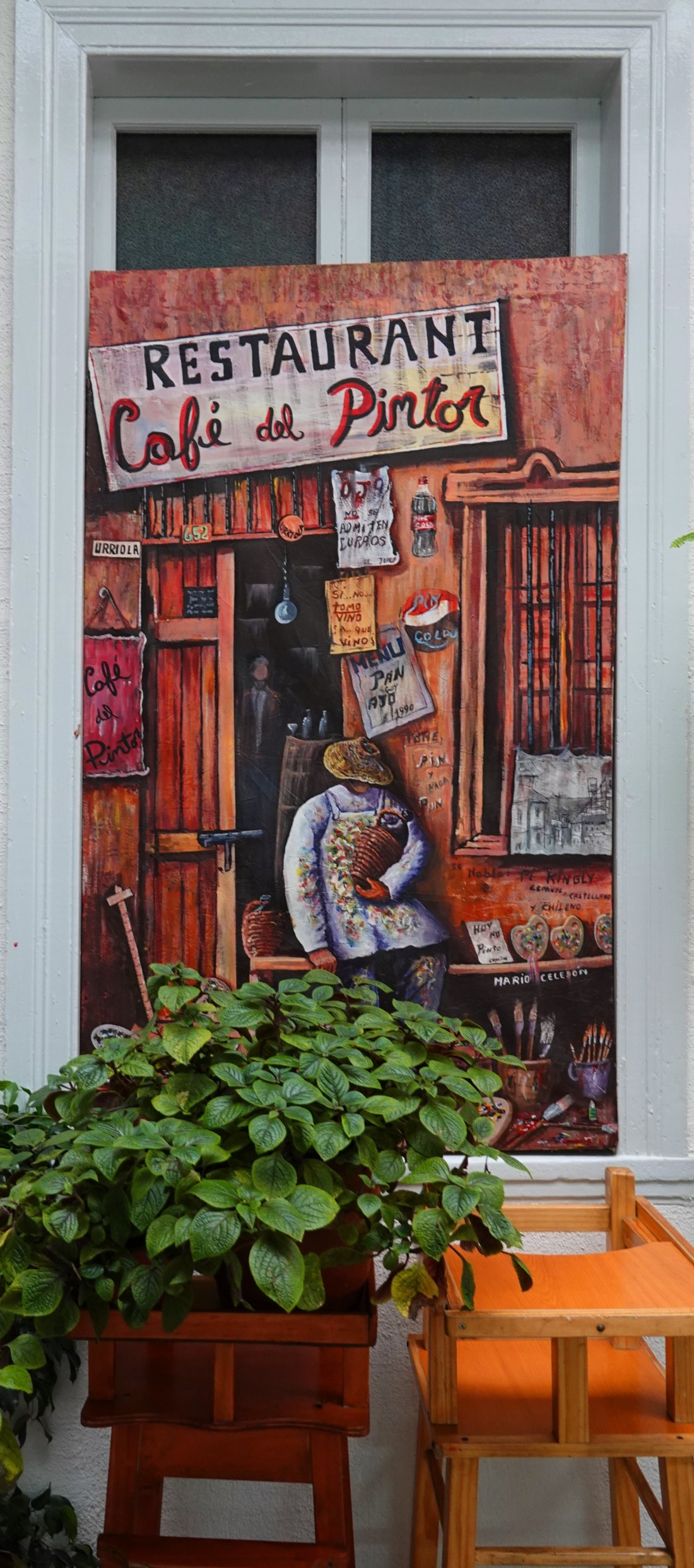 The first two paintings of the café sign and the entry door were done by the Chilean student, and are depictions of Valparaiso…