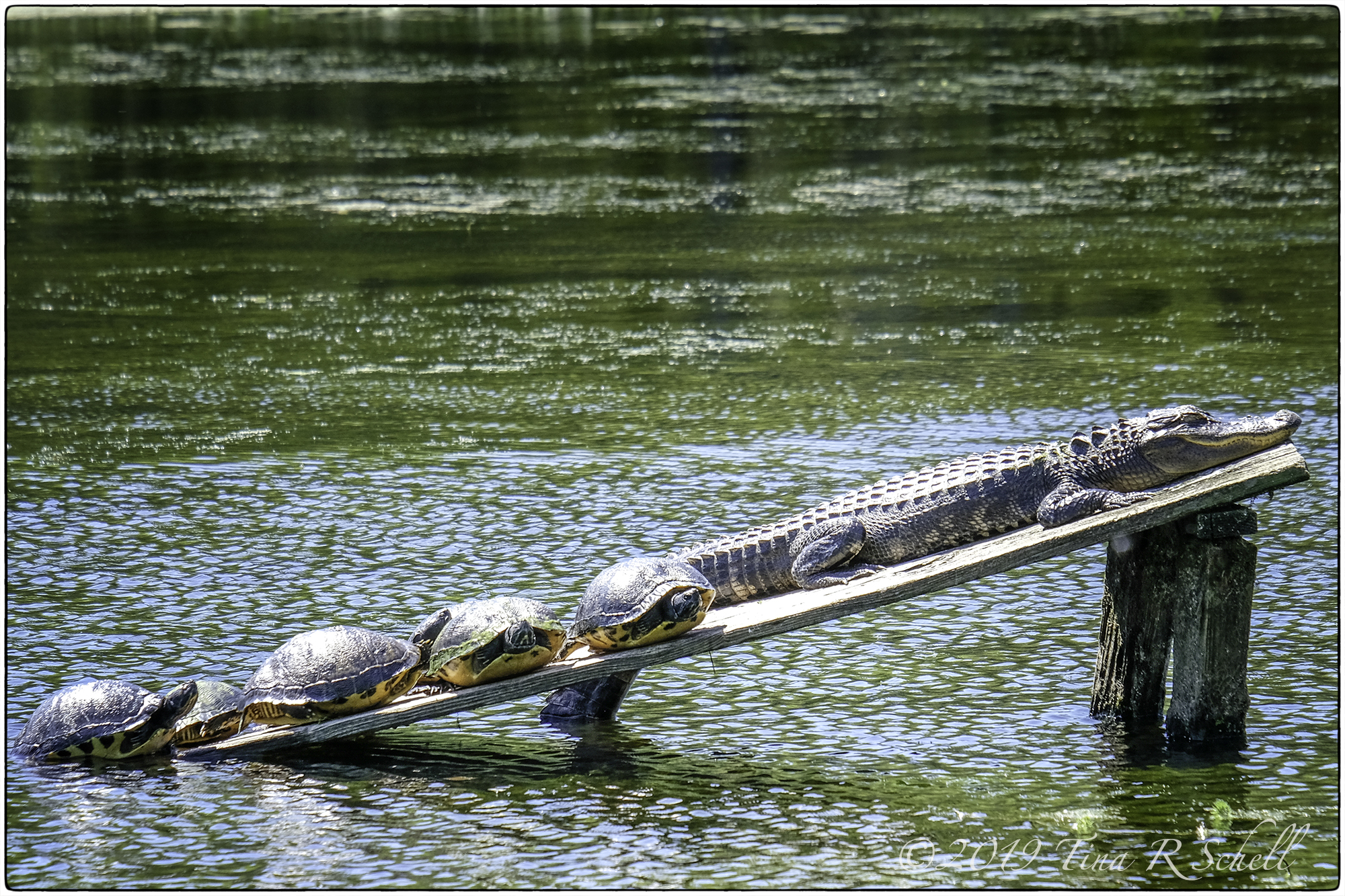 turtles, alligator sunning LESS ROOM FOR MORE TURTLES